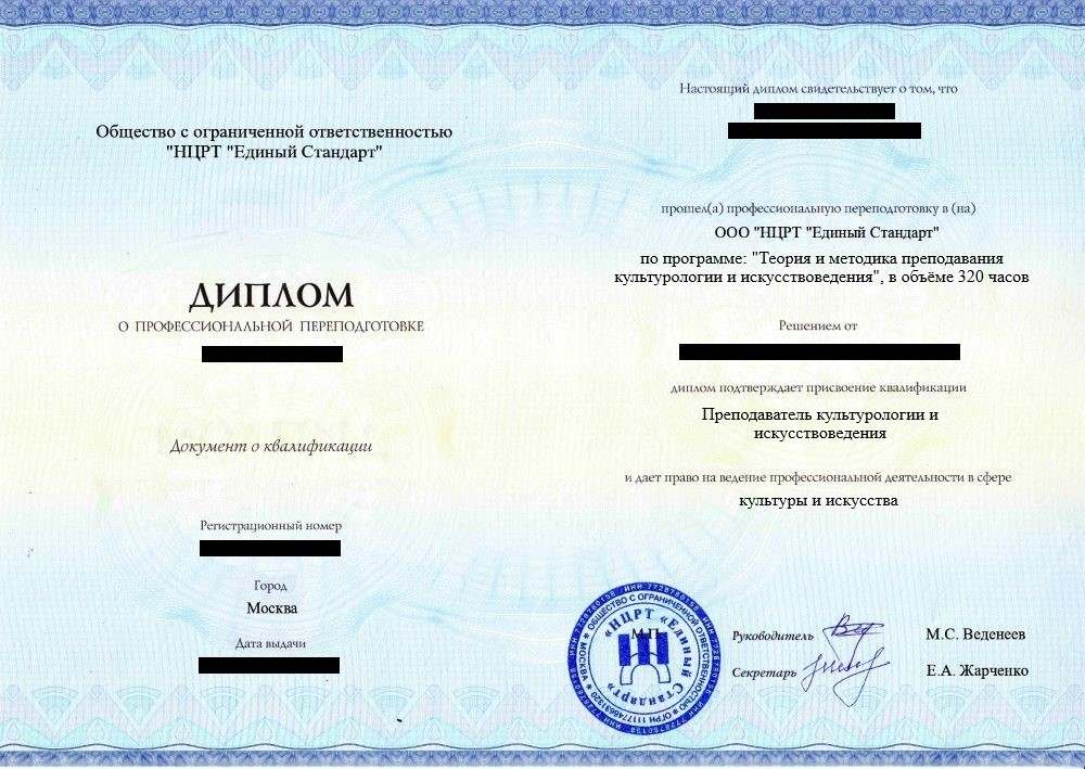 • «Преподаватель культурологии и искусствоведения» с правом осуществления профессиональной деятельности в сфере культуры и искусства